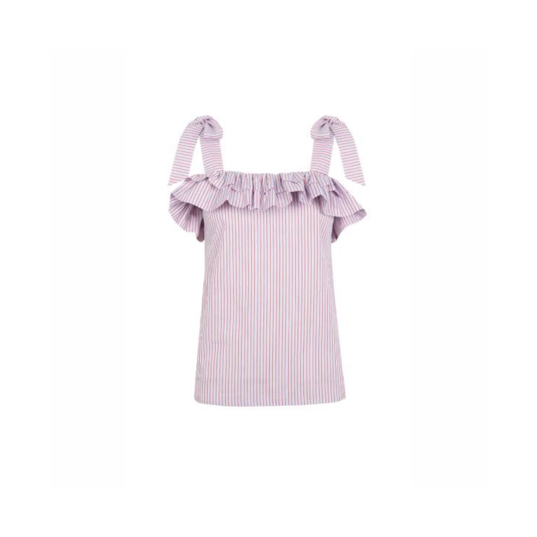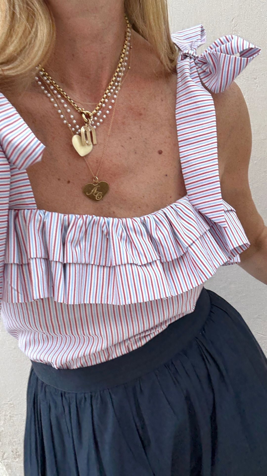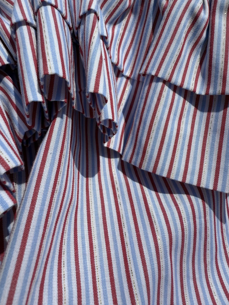 Este top presenta una silueta recta con delicados tirantes anudados en los hombros y un elegante volante frontal que aporta volumen y feminidad. Confeccionado completamente a mano, destaca por su estructura refinada y sus acabados meticulosos. Elaborado en un tejido de rayas blancas, rojas y azules con un sutil hilo dorado, representa una expresión atemporal de sofisticación.