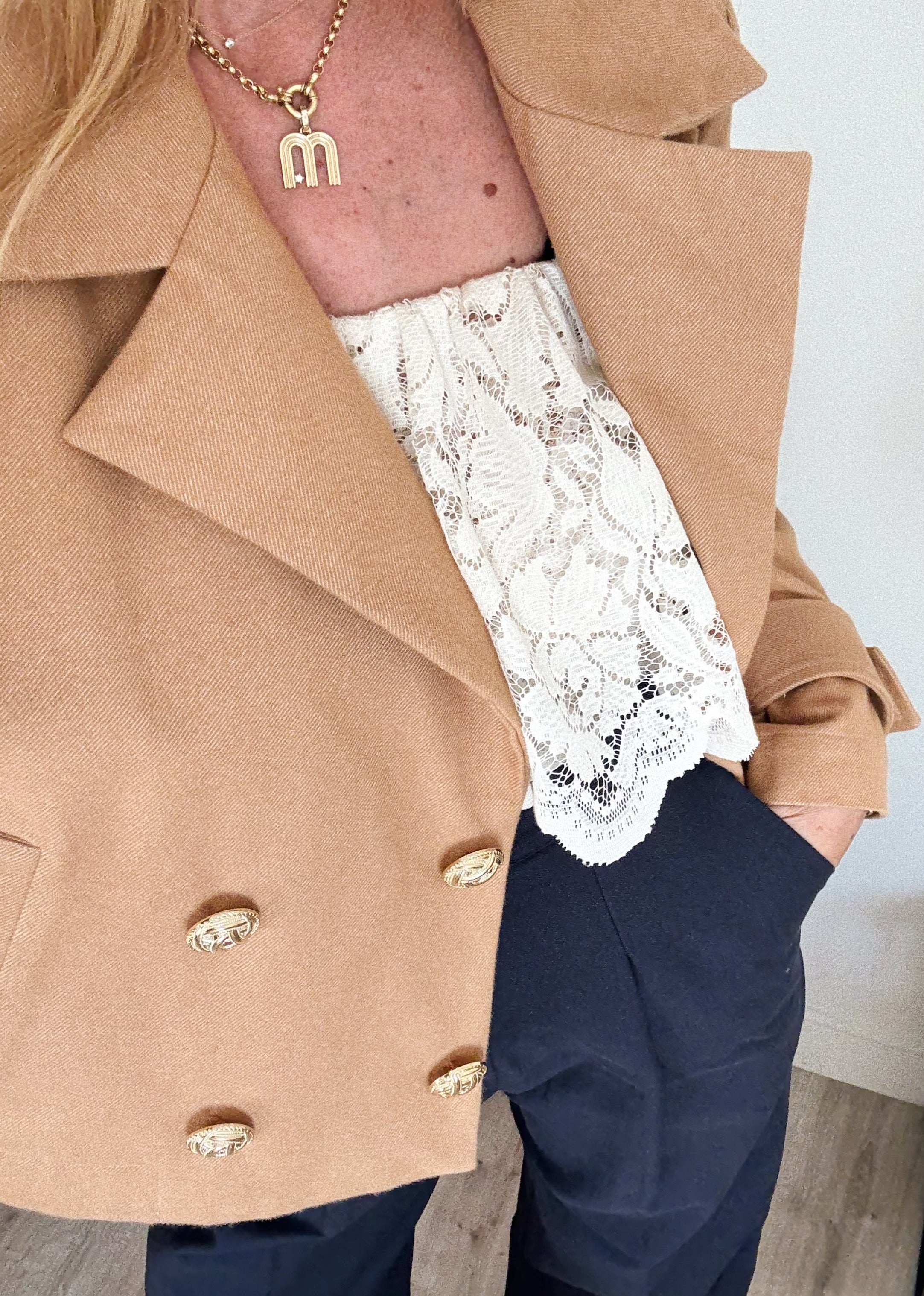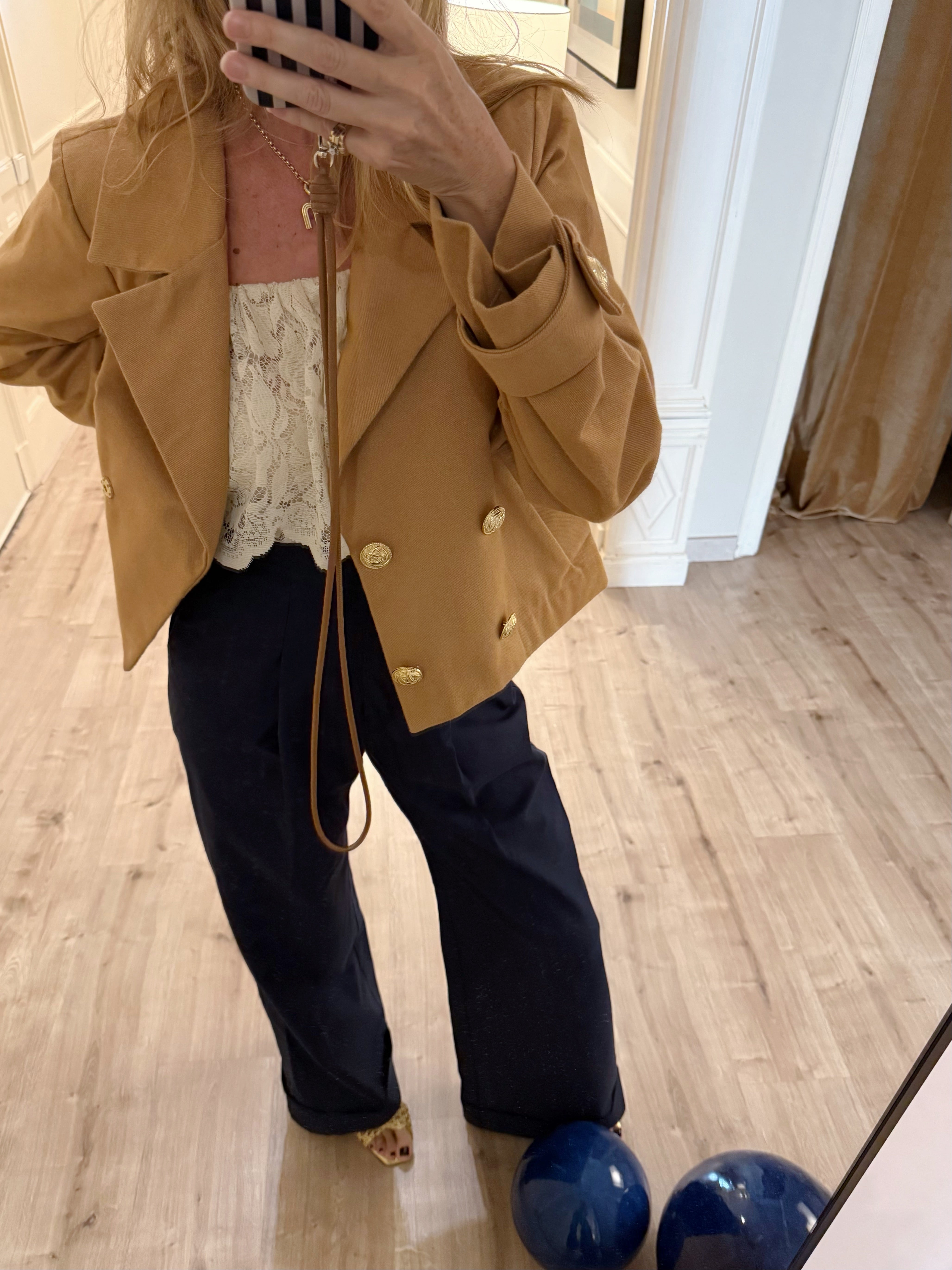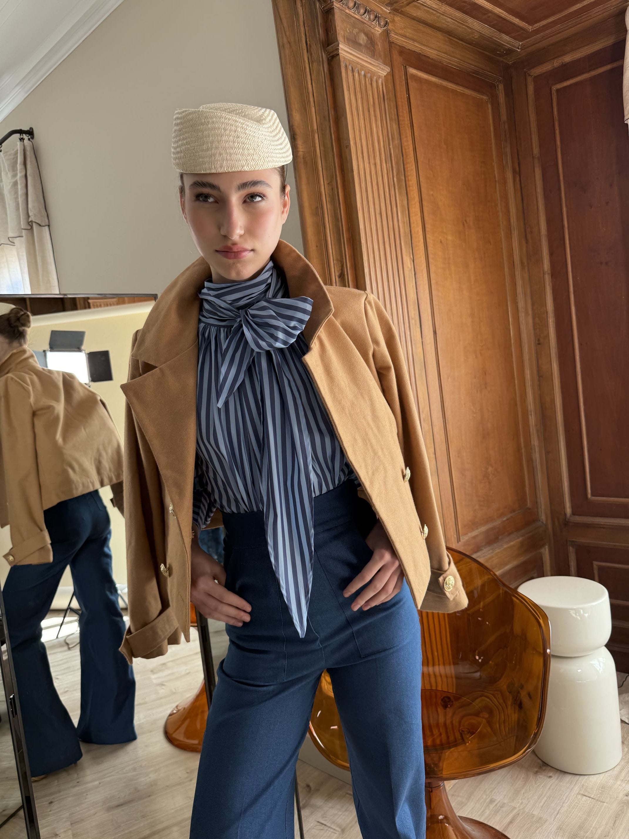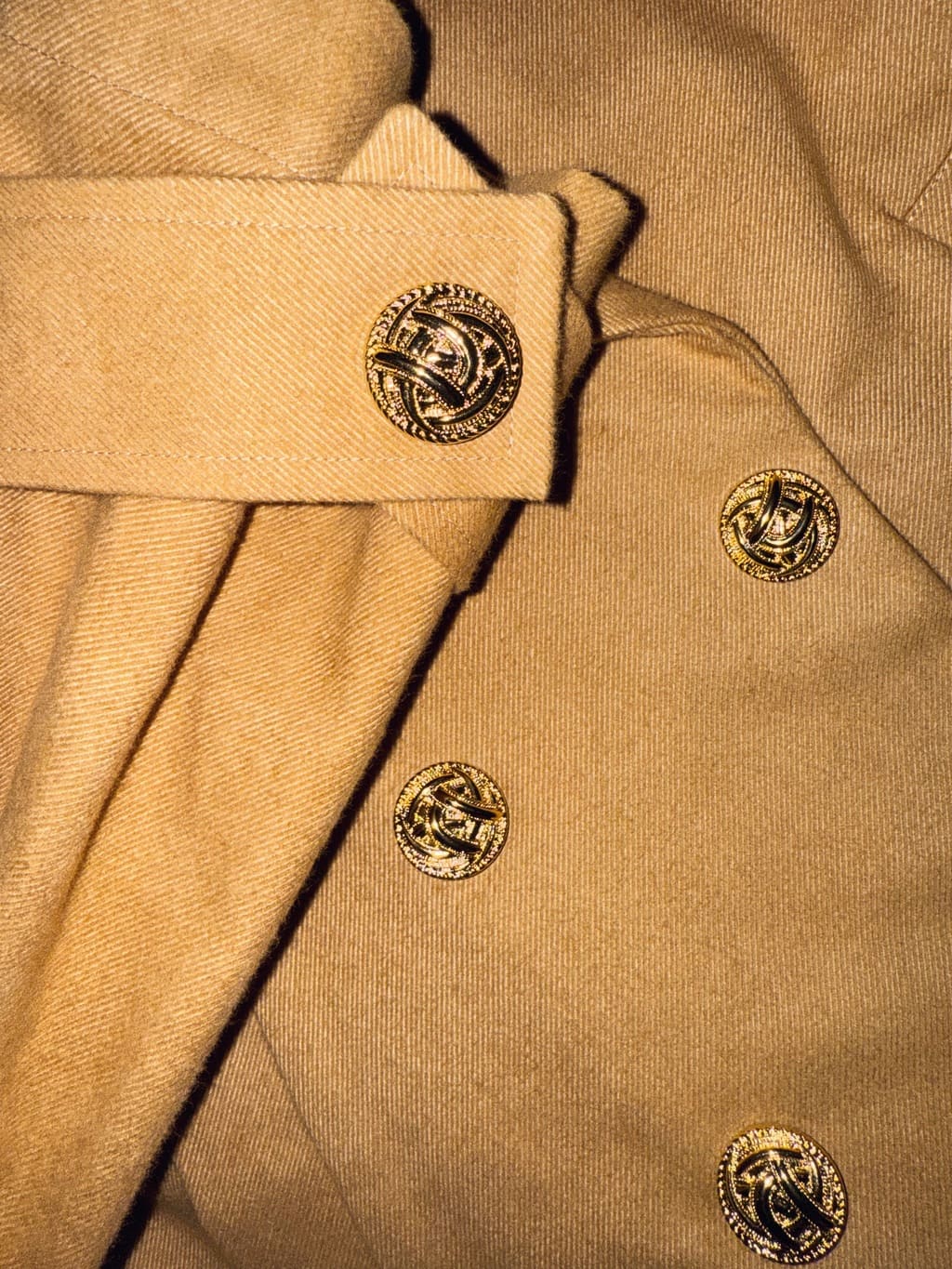 Confeccionada a mano en España en algodón “Melange” 100% de alto gramaje, esta cazadora en tono camel destaca por su estructura impecable y su aire atemporal. El diseño se realza con grandes solapas y botones dorados de carácter joya, presentes tanto en el delantero como en los puños, que aportan un toque sofisticado y distintivo.
