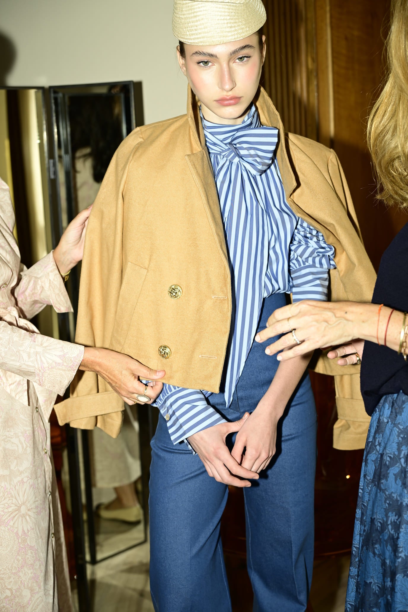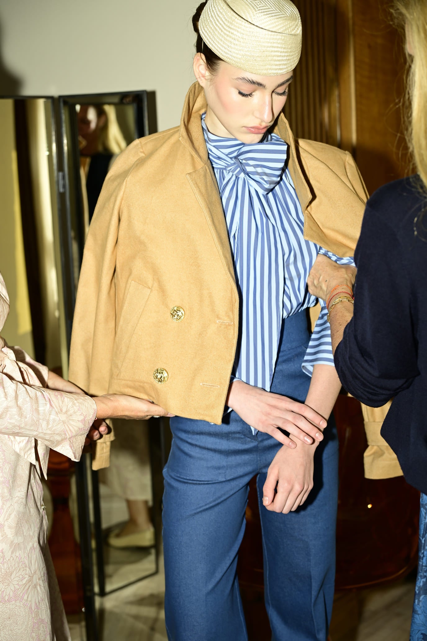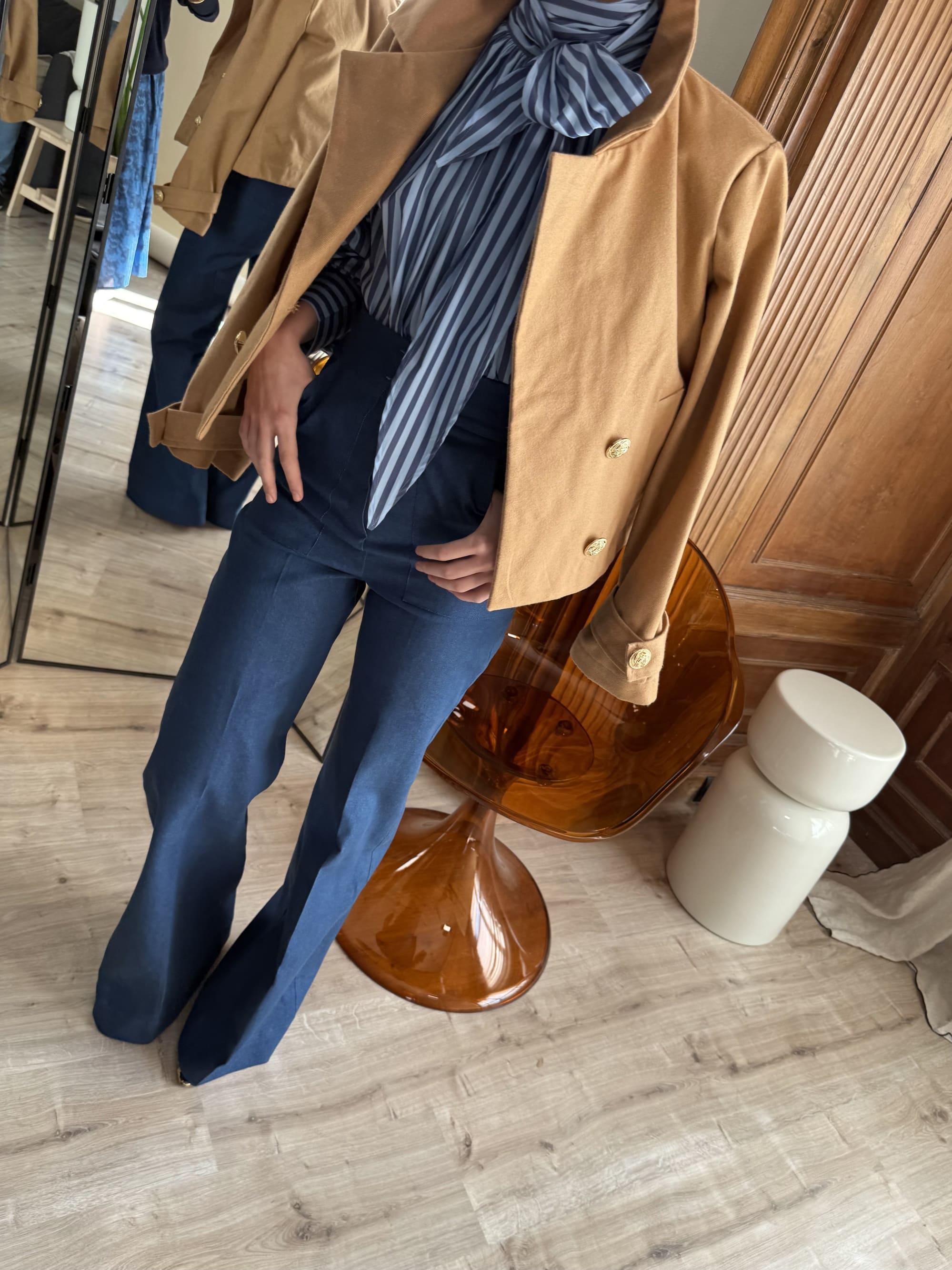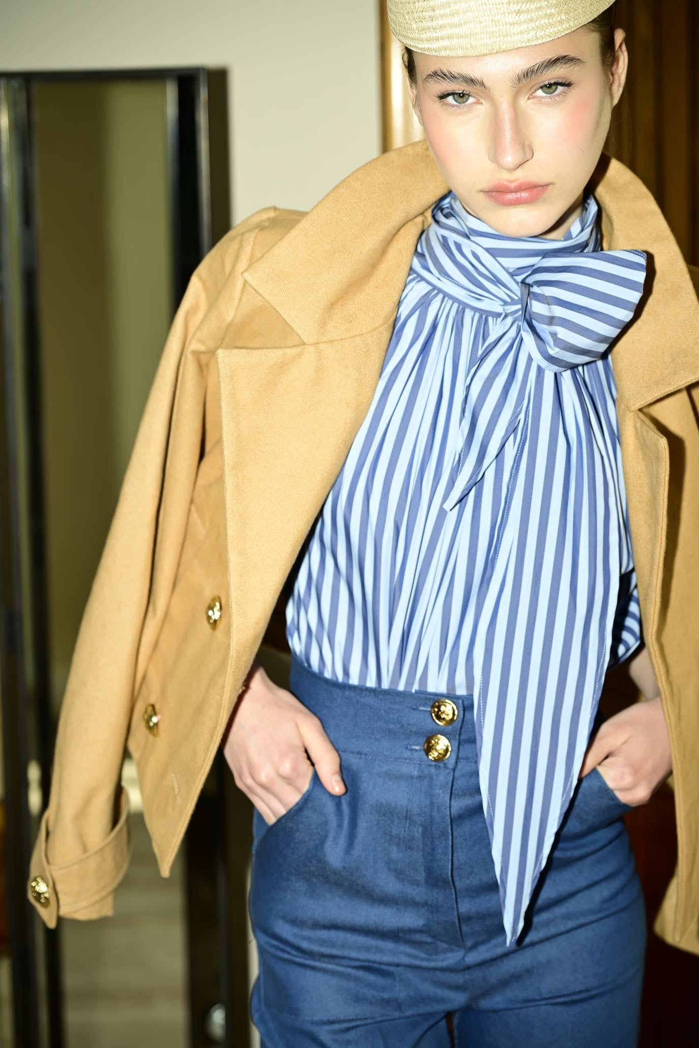 Confeccionada a mano en España en algodón “Melange” 100% de alto gramaje, esta cazadora en tono camel destaca por su estructura impecable y su aire atemporal. El diseño se realza con grandes solapas y botones dorados de carácter joya, presentes tanto en el delantero como en los puños, que aportan un toque sofisticado y distintivo.