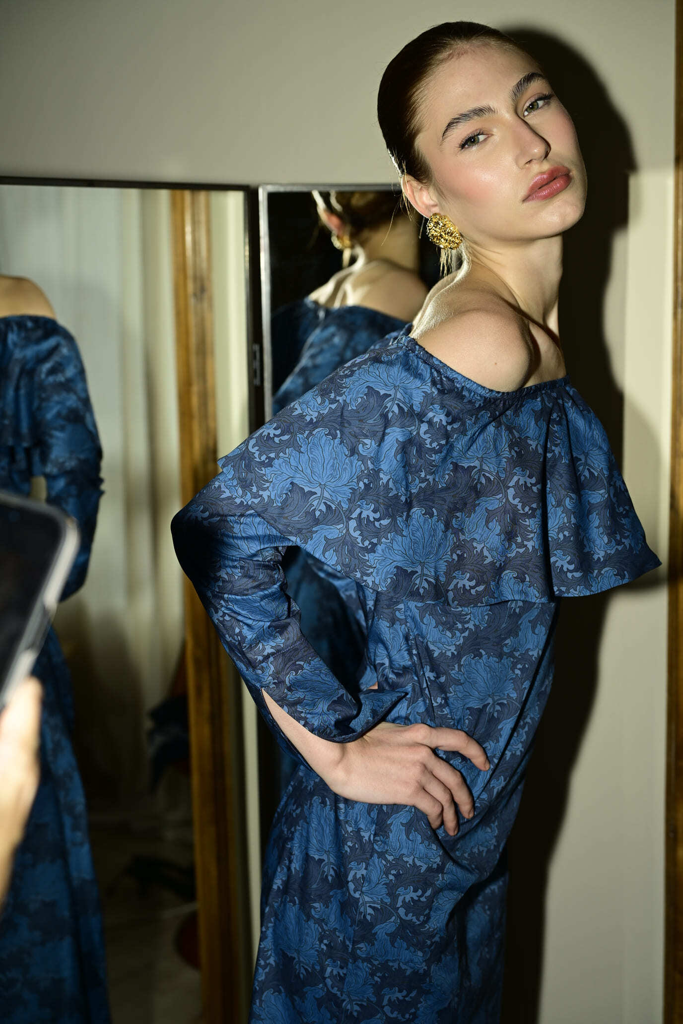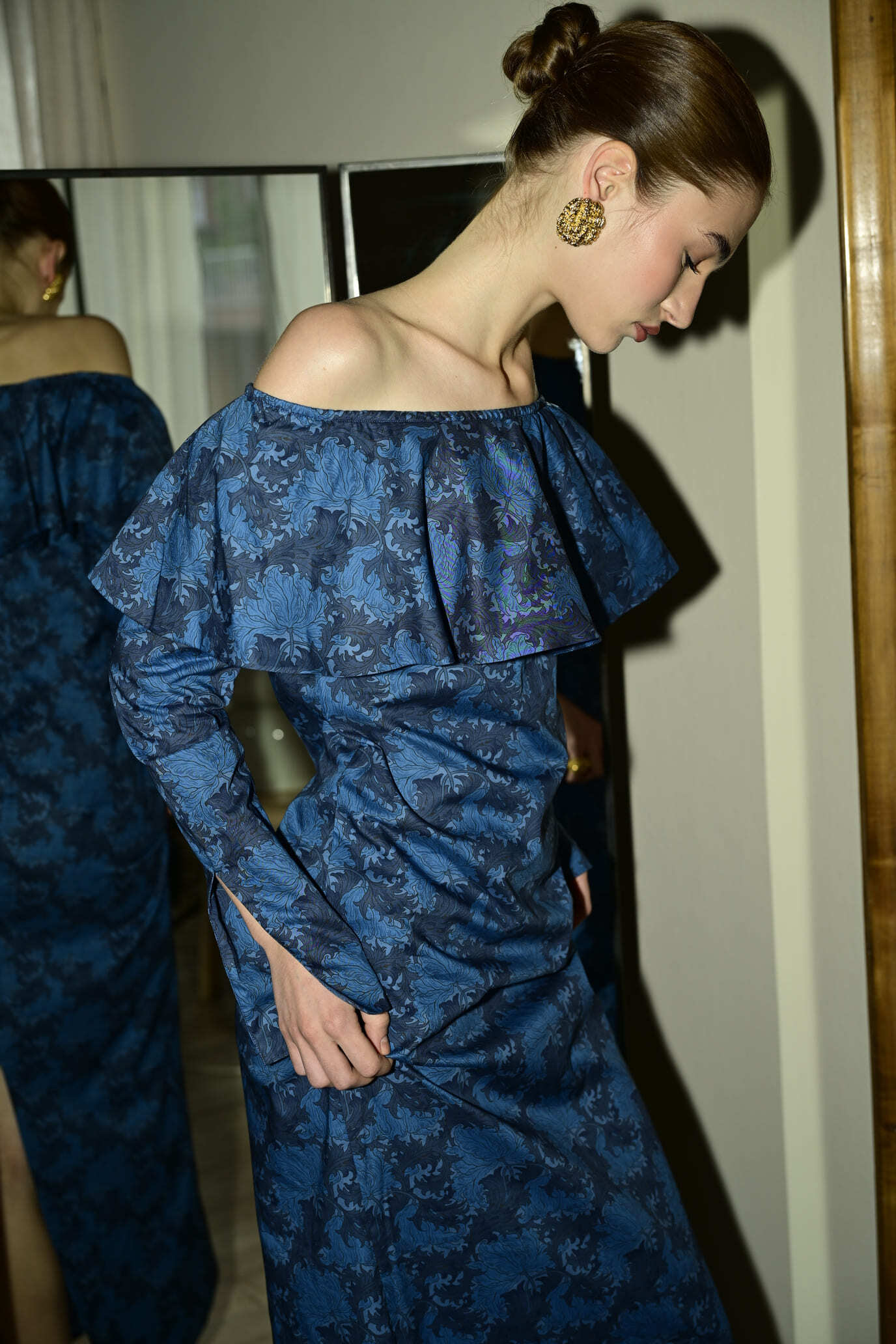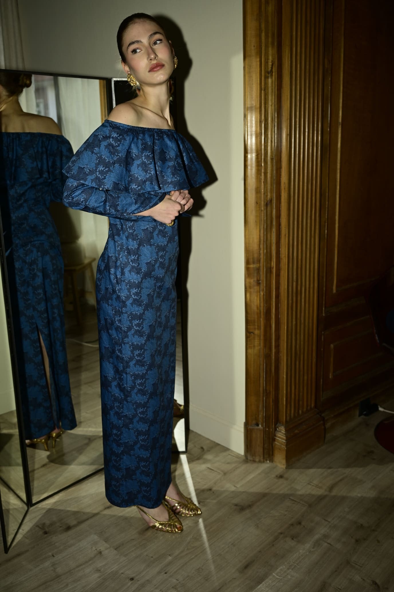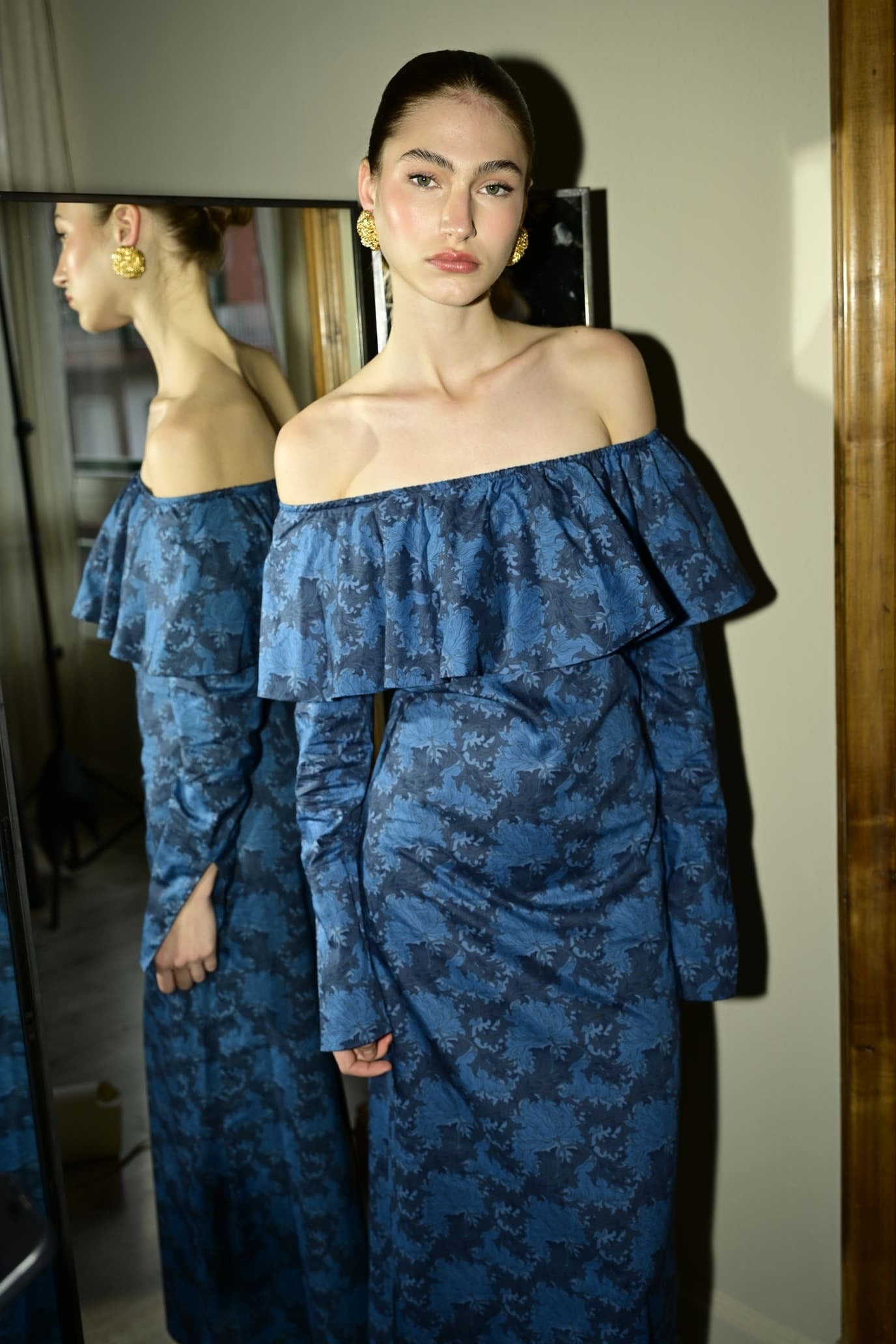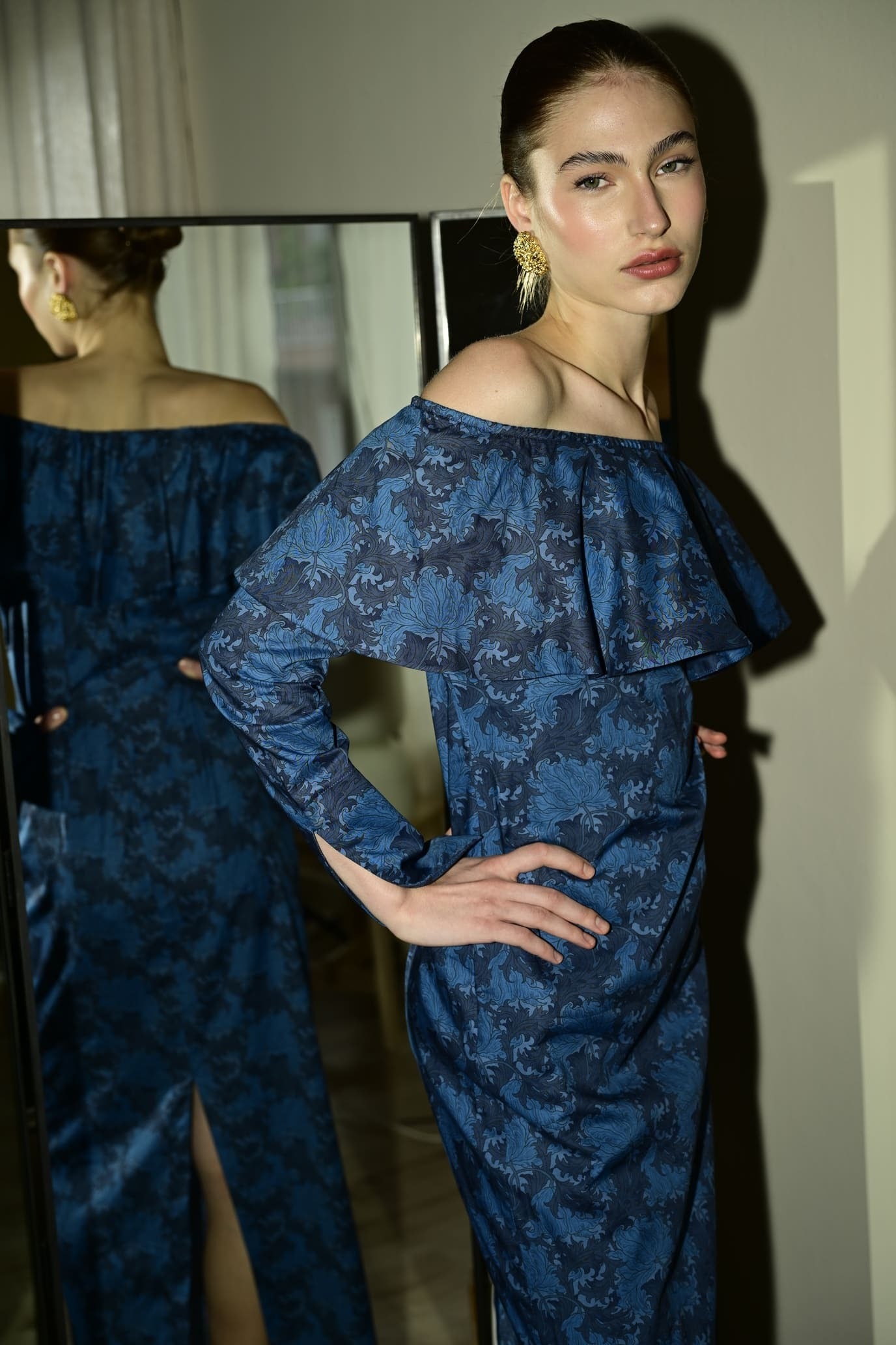 Este elegante vestido con escote bardot está confeccionado en algodón blue fabrics con un estampado floral. Su amplio volante en el escote realza los hombros, mientras que la silueta recta aporta modernidad. Una pieza atemporal que transmite feminidad, movimiento y encanto. With a side closure featuring an invisible zipper for added comfort.