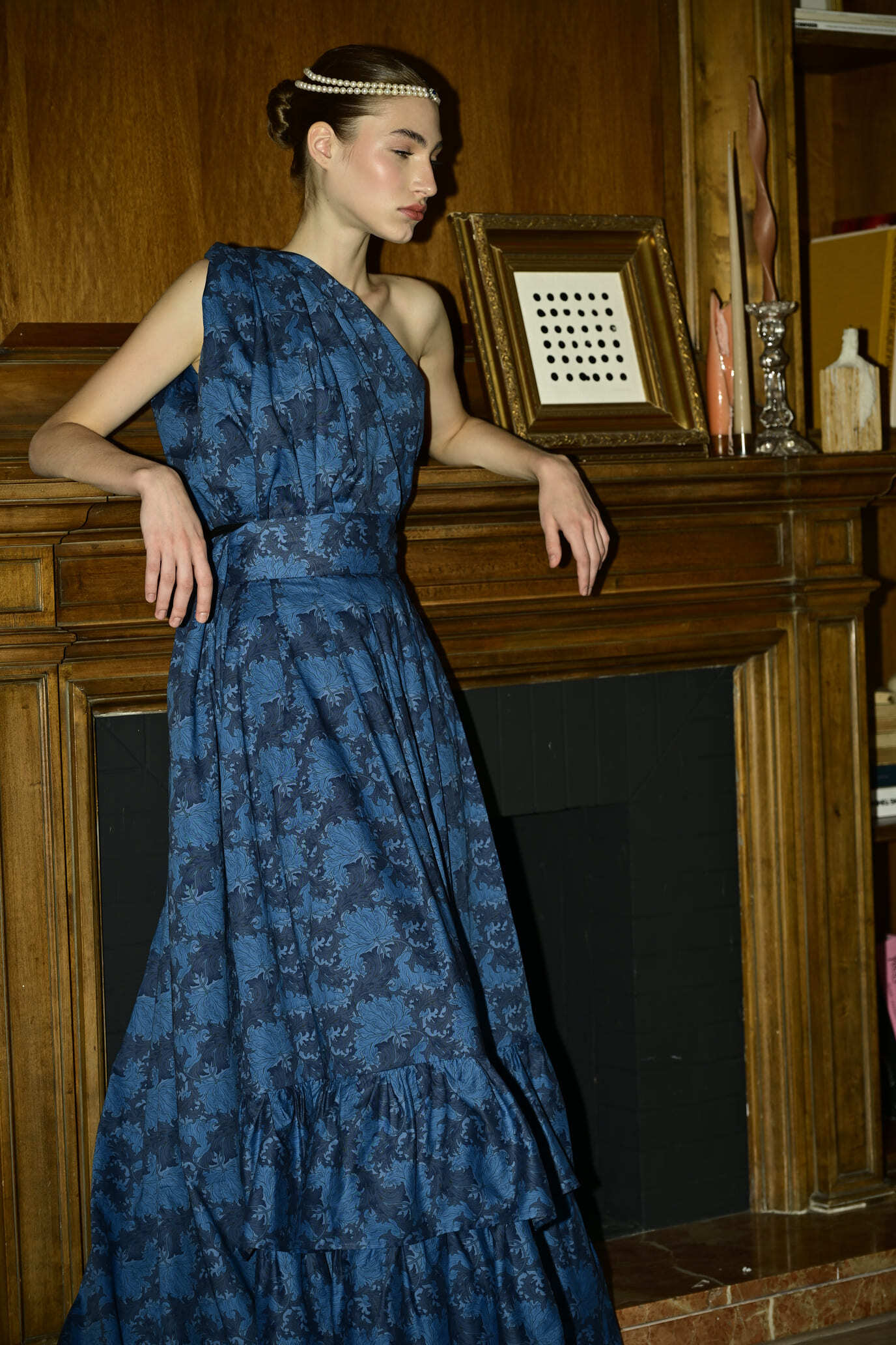 Falda larga confeccionada en un tejido de algodón 100% diseñado en exclusiva por la prestigiosa casa Liberty Fabrics para Nina Blanc con flores azules. Con pliegues arquitectónicos, cintura estructurada y bajo con volantes. Una silueta atemporal que combina artesanía tradicional y un toque moderno. Si dudas entre dos tallas te recomendamos la superior.