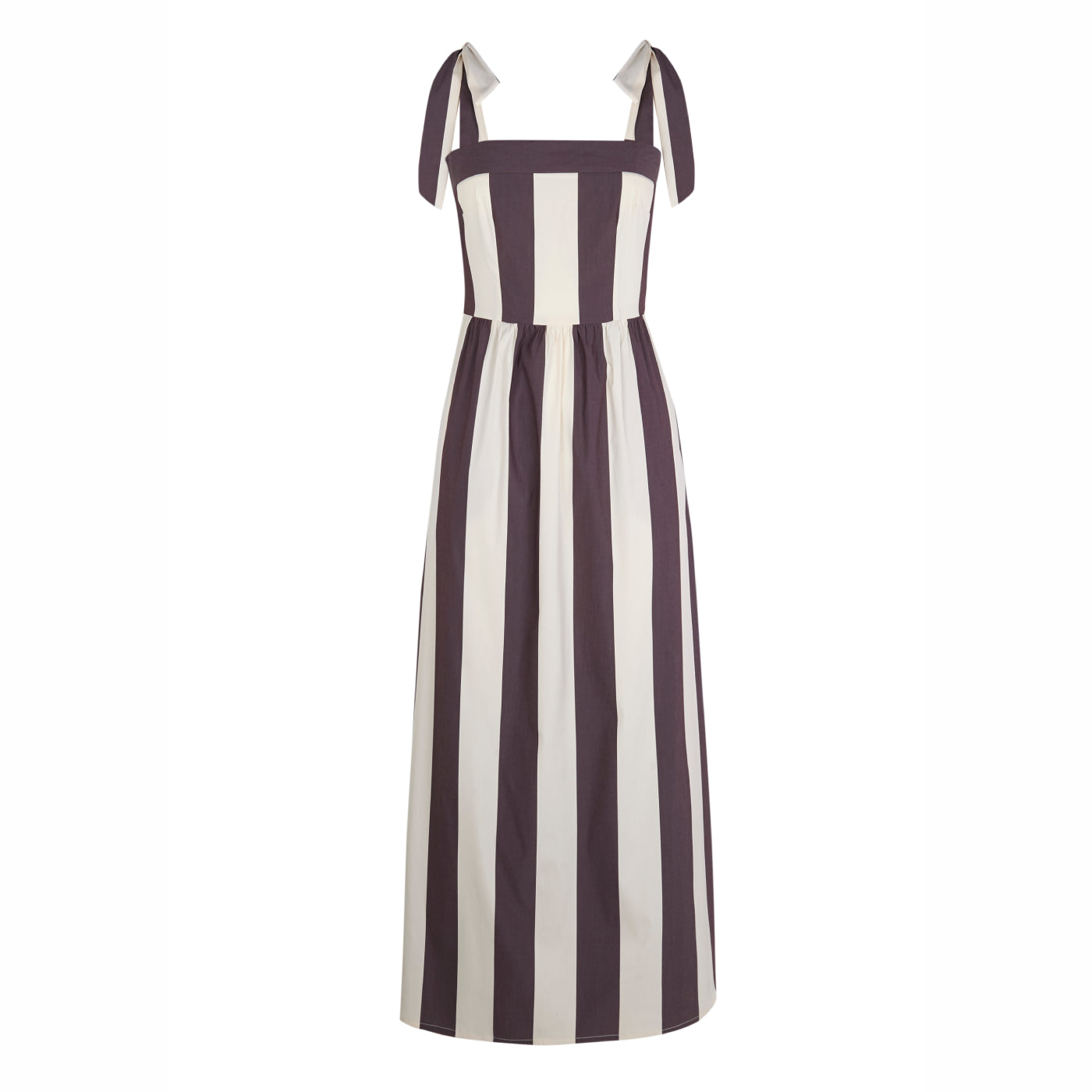 Elegante y confeccionado a mano, nuestro vestido Val es largo hasta el tobillo, está hecho en un tejido a rayas marrón y marfil. Cuenta con un cuerpo estructurado, delicados lazos en los hombros y una cintura suavemente fruncida, que crea una silueta recta, sofisticada y alargada. Tiene bolsillos y cierre trasero con cremallera.