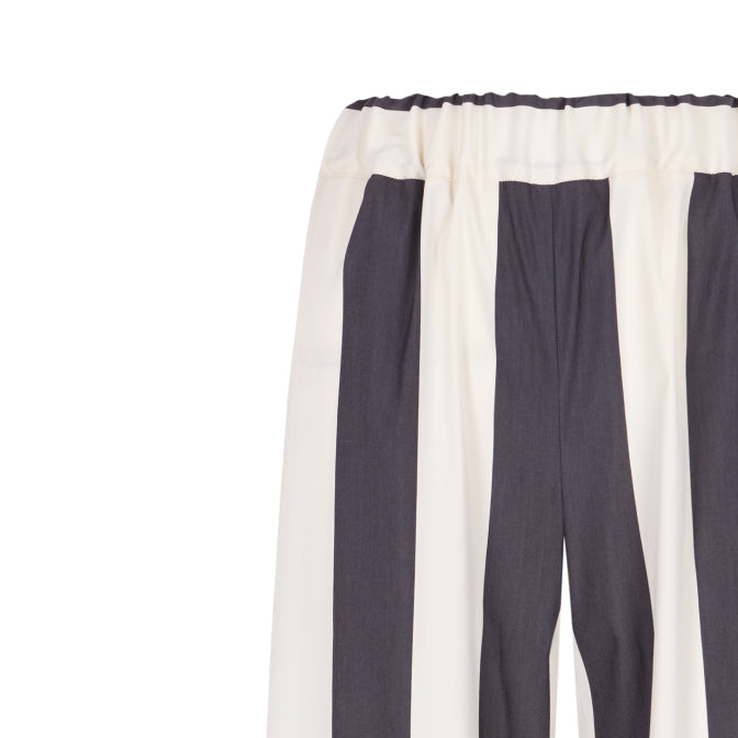 Cuidadosamente confeccionado en un tejido a rayas marfil y negro humo. Pantalón pijamero de tiro alto con un diseño elegante. Su silueta recta alarga visualmente las piernas, manteniendo una caída fluida y sin esfuerzo. Una cómoda cinturilla elástica garantiza un ajuste flexible y favorecedor para distintas tallas sin sacrificar el estilo.