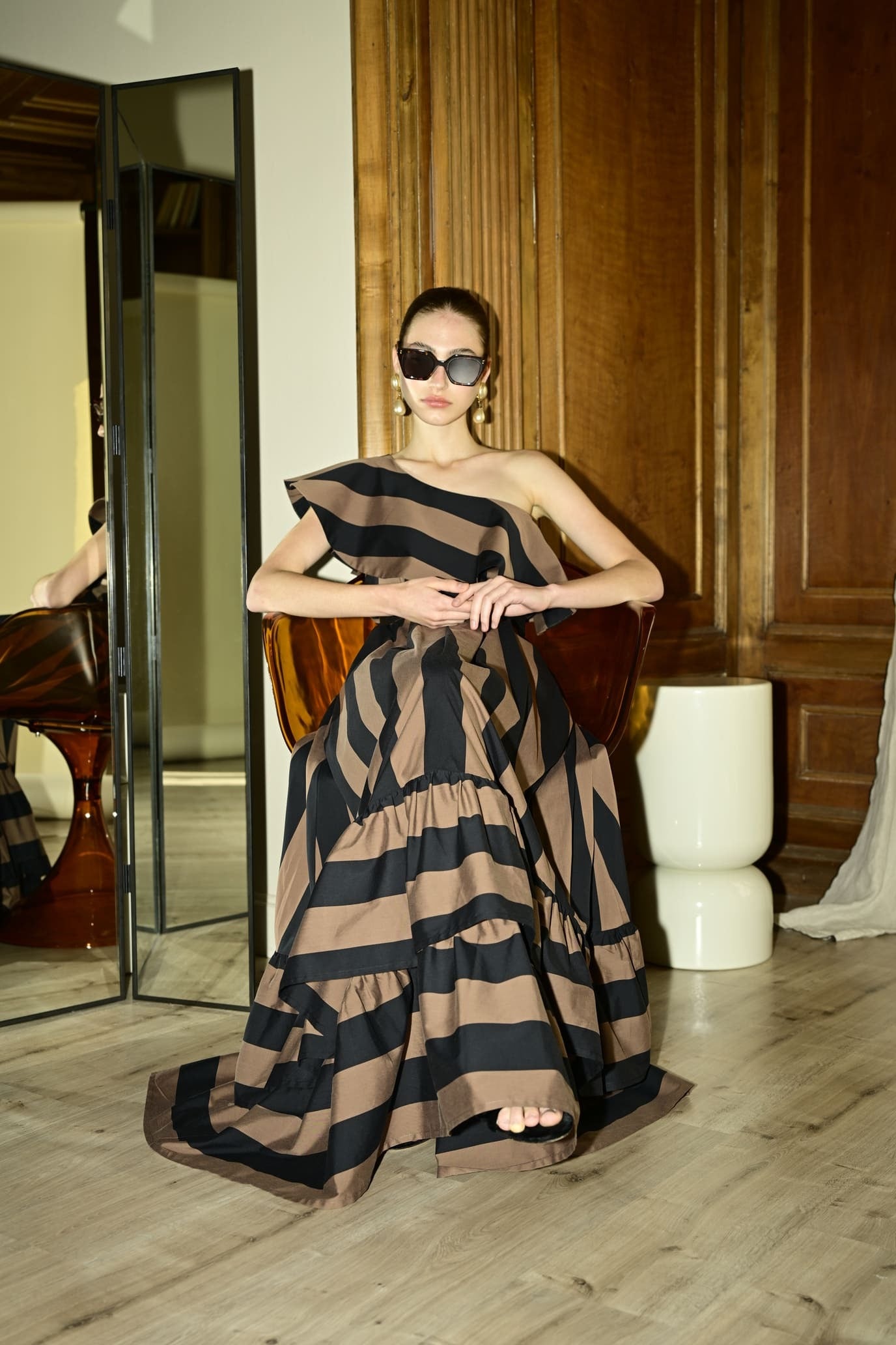 Esta falda larga está confeccionada en rayas negras y marrones. Con pliegues arquitectónicos, cintura estructurada y bajo en con volantes. Una silueta atemporal que combina artesanía tradicional y un toque moderno. Si dudas entre dos tallas te recomendamos la superior.