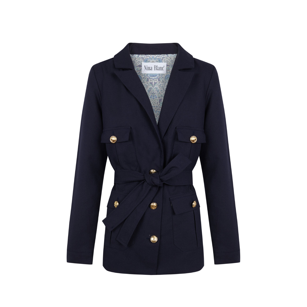 Sahariana azul marino en un tejido azul marino, con solapas estructuradas, bolsillos delanteros con solapa y botones dorados grabados. Incluye cinturón del mismo tejido que realza la silueta femenina. Un diseño versátil y atemporal que combina elegancia y funcionalidad, ideal para atuendos sofisticados o para eventos especiales.