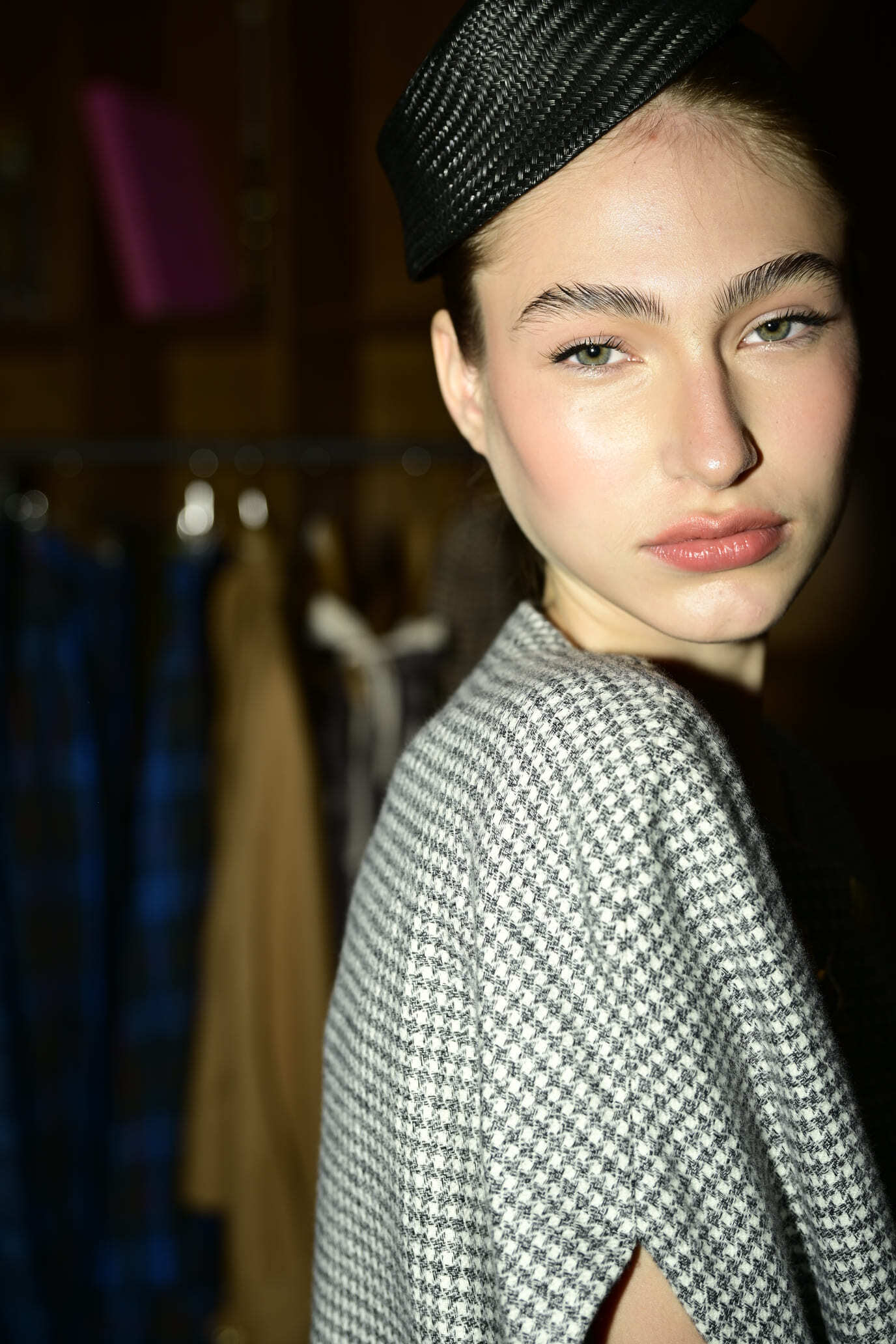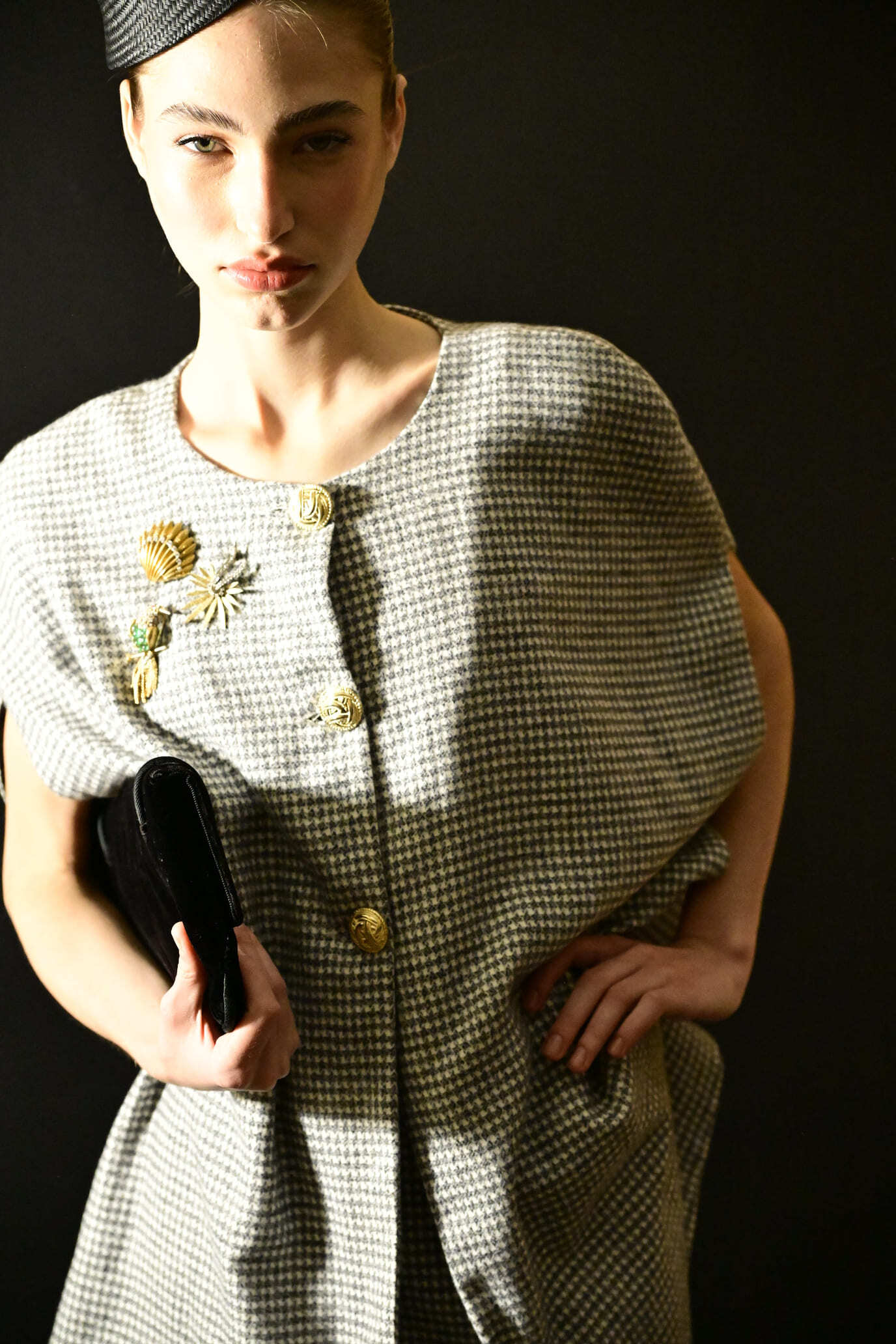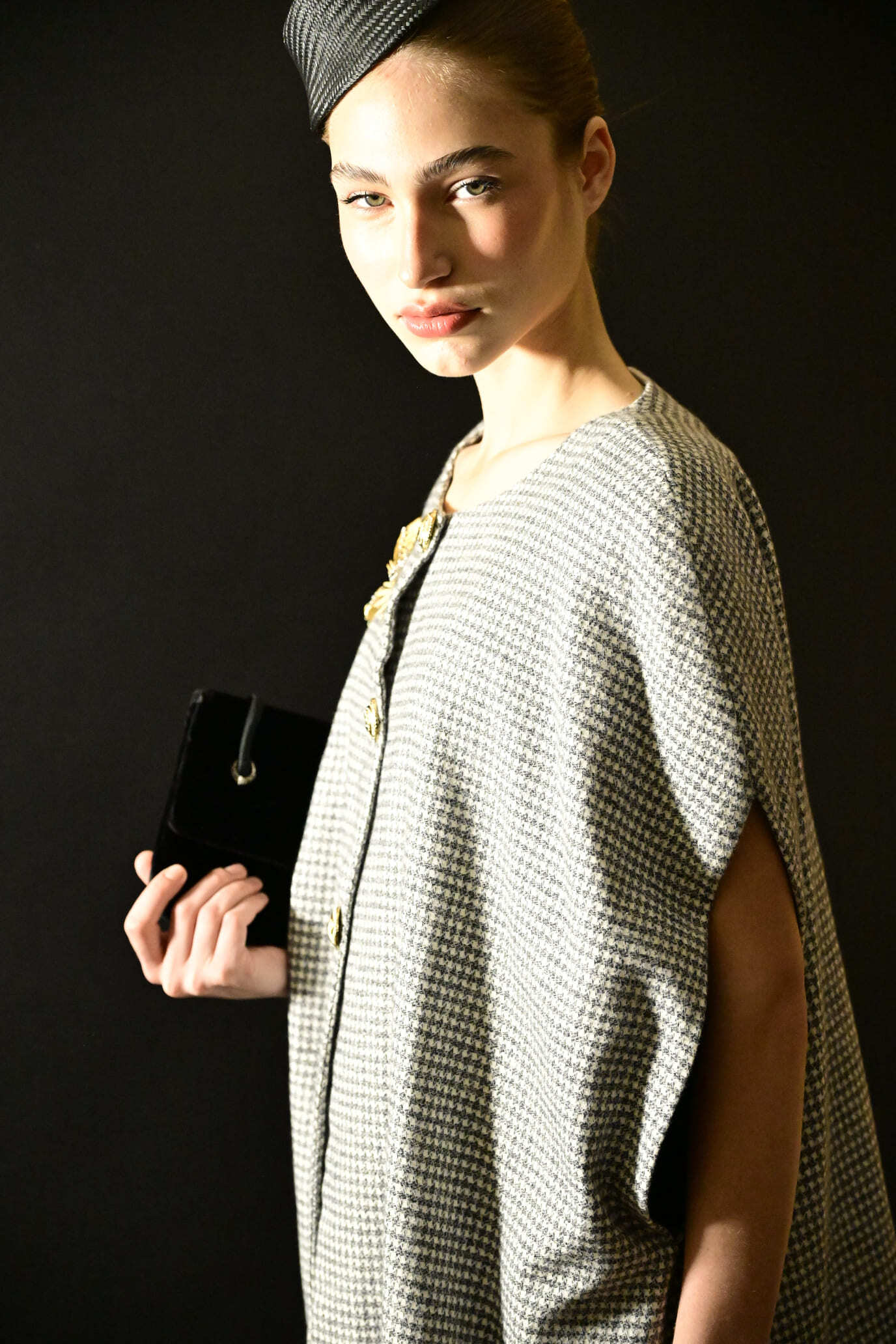 Elegante y cómoda capa confeccionada en tejido 100% algodón Mouliné en pata de gallo negra y blanca y forrada en algodón negro.