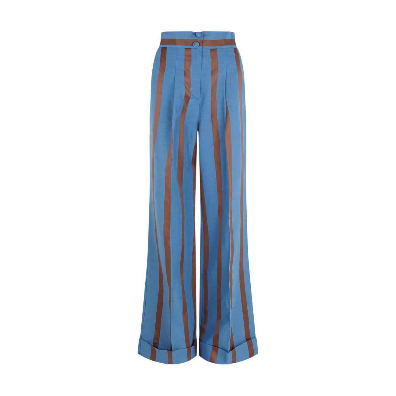 El Rochester Tommy Trouser reinventa una silueta clásica con un toque de refinada elegancia. Confeccionado en nuestro taller en una exquisita mezcla de tencel y lino, presenta una base azul francés con finas rayas marrón chocolate, una combinación atemporal y elegante. El dobladillo en el bajo y los dos grandes botones dorados aportan un aire sofisticado a esta prenda versátil.