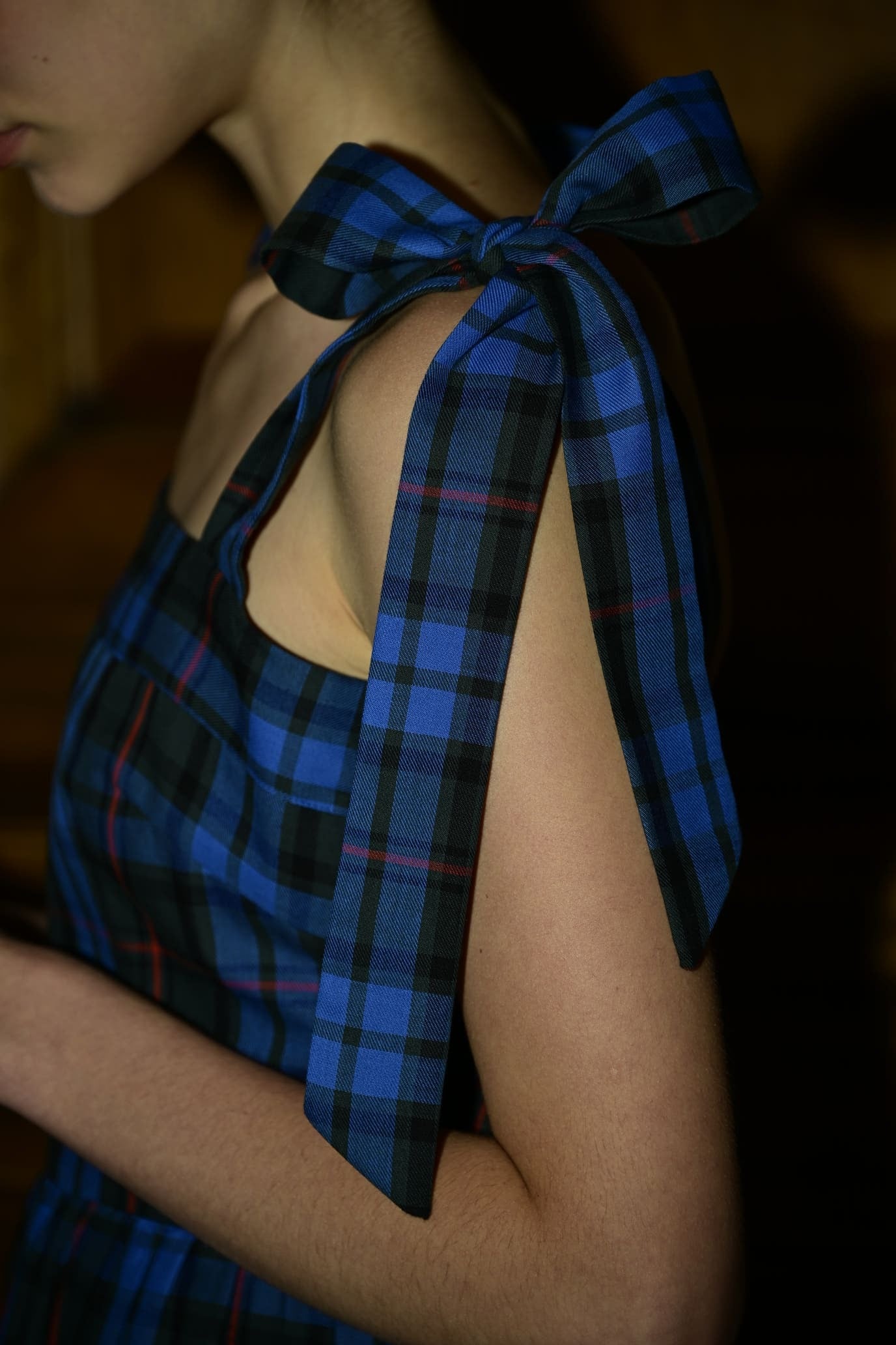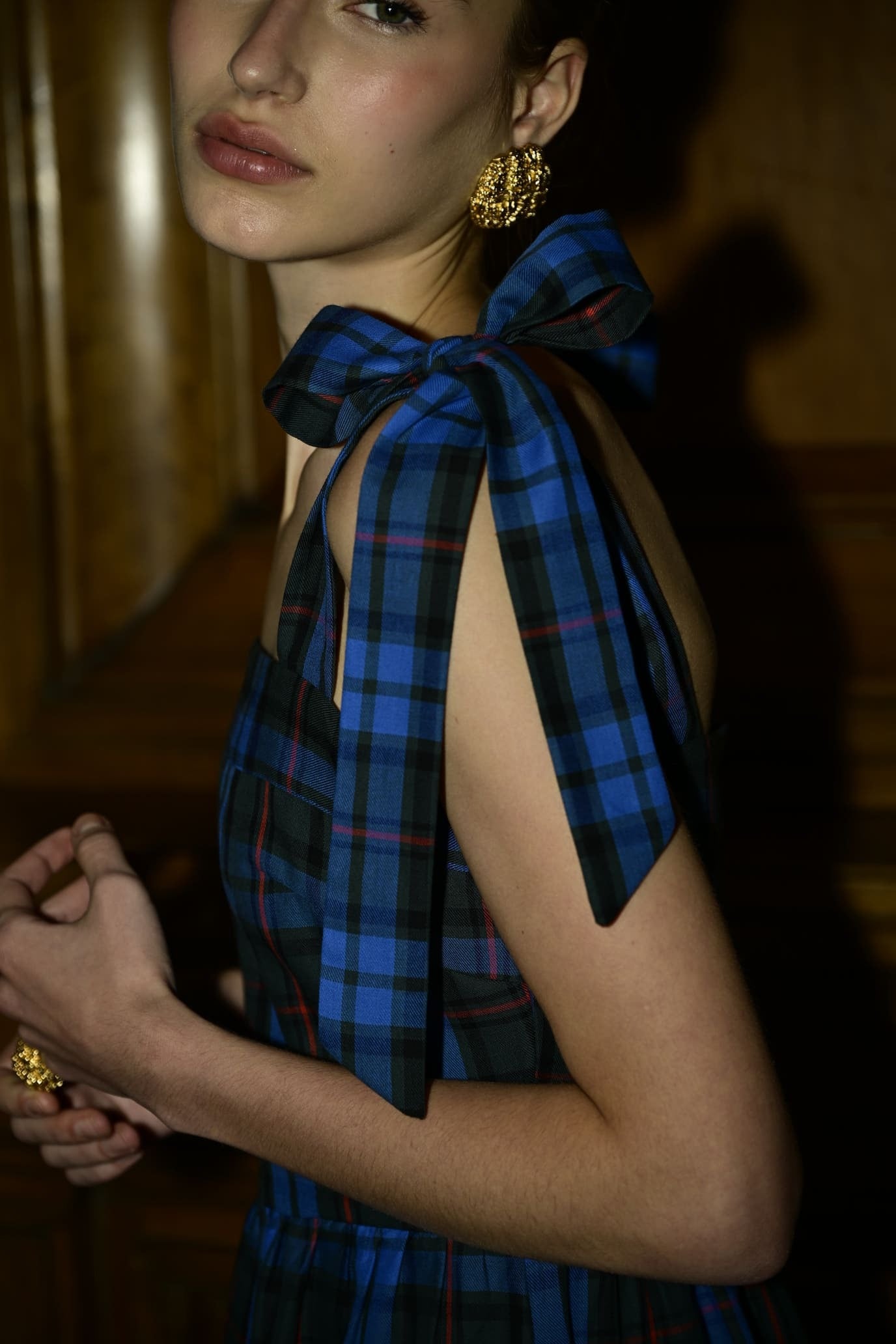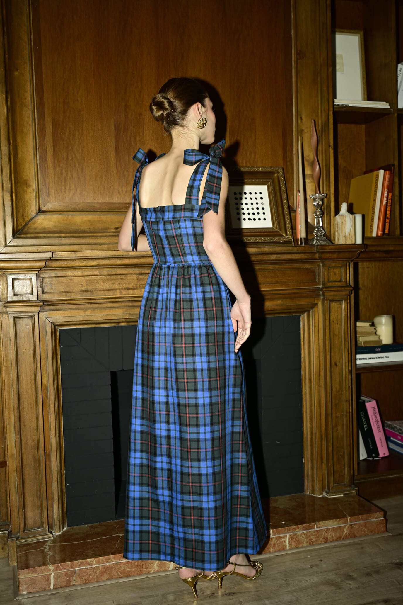 Elegante y confeccionado a mano, nuestro vestido Val es largo hasta el tobillo, está confeccionado a mano en nuestro taller en un elegante tartán en tonos verdes y azul eléctrico en 100% algodón. Cuenta con un cuerpo estructurado, delicados lazos en los hombros y una cintura suavemente fruncida, que crea una silueta recta, sofisticada y alargada. Tiene bolsillos y cierre trasero con cremallera.