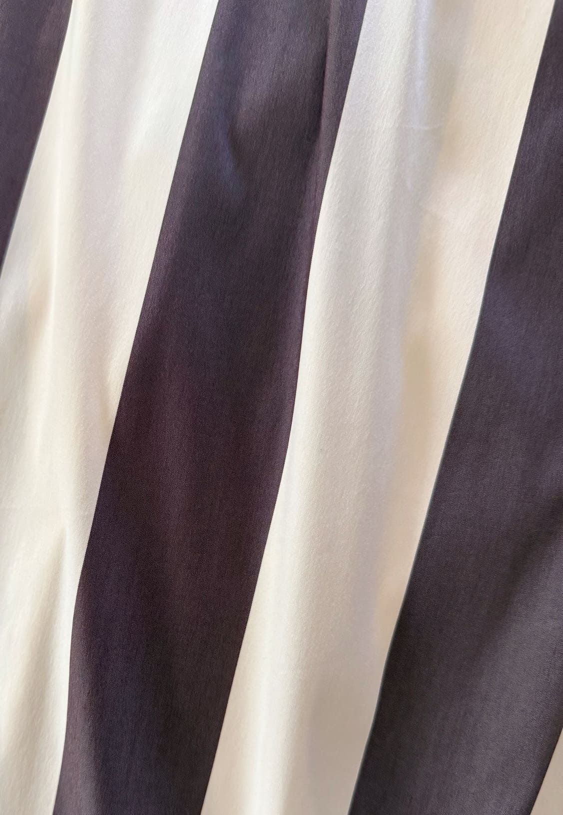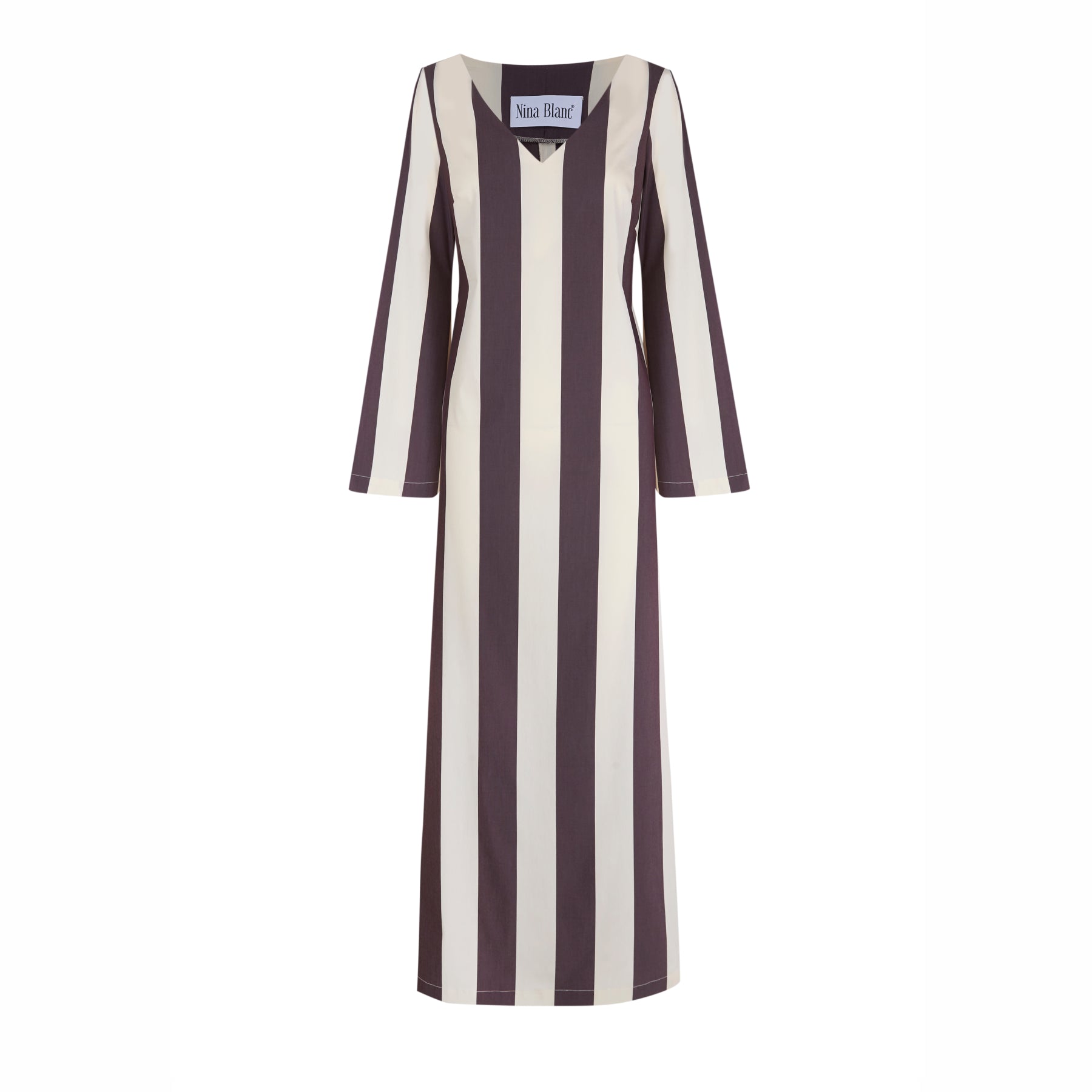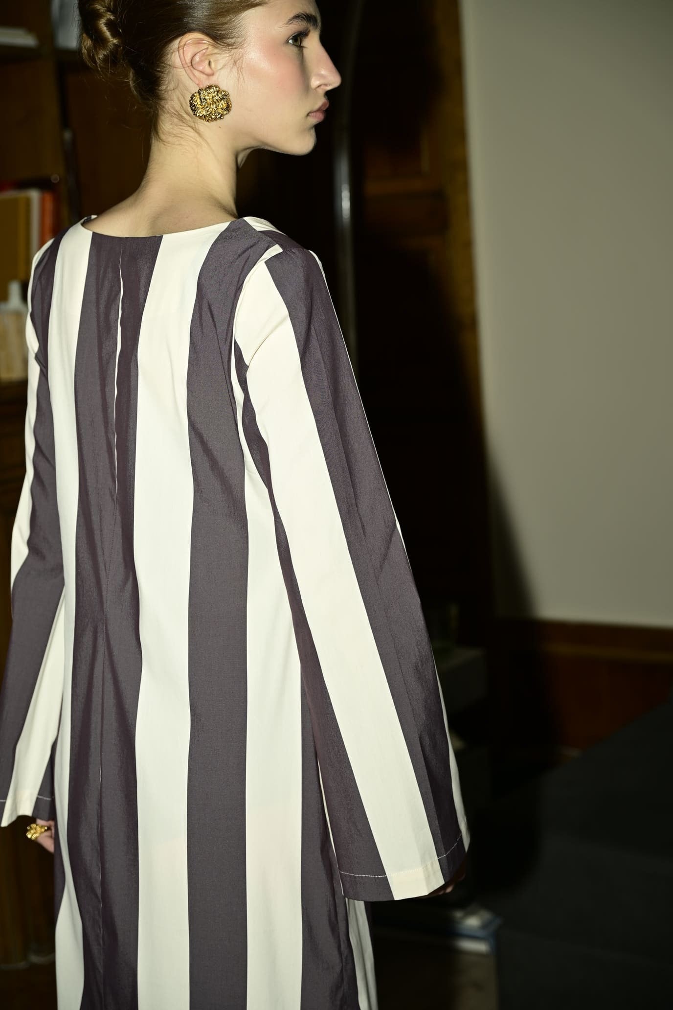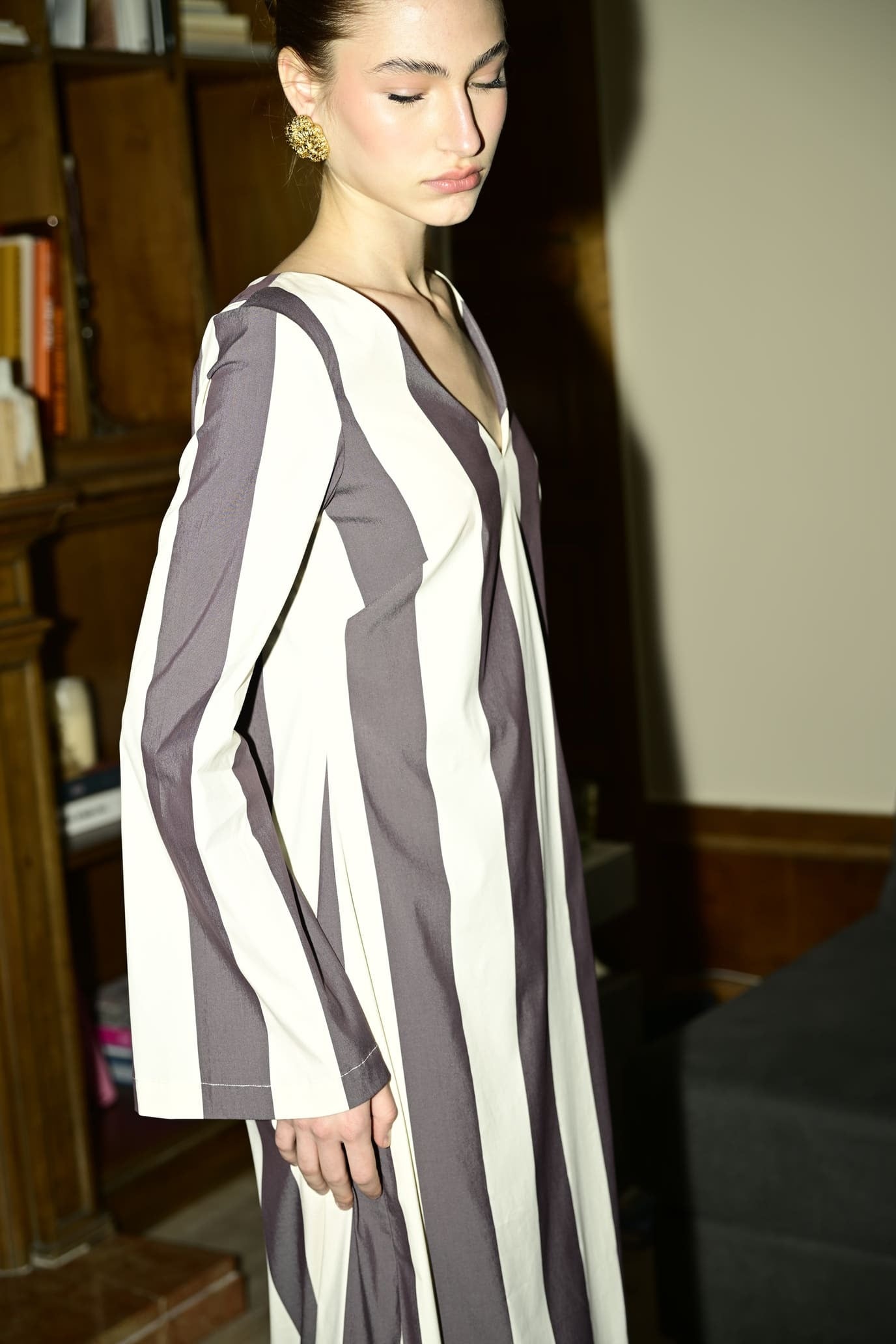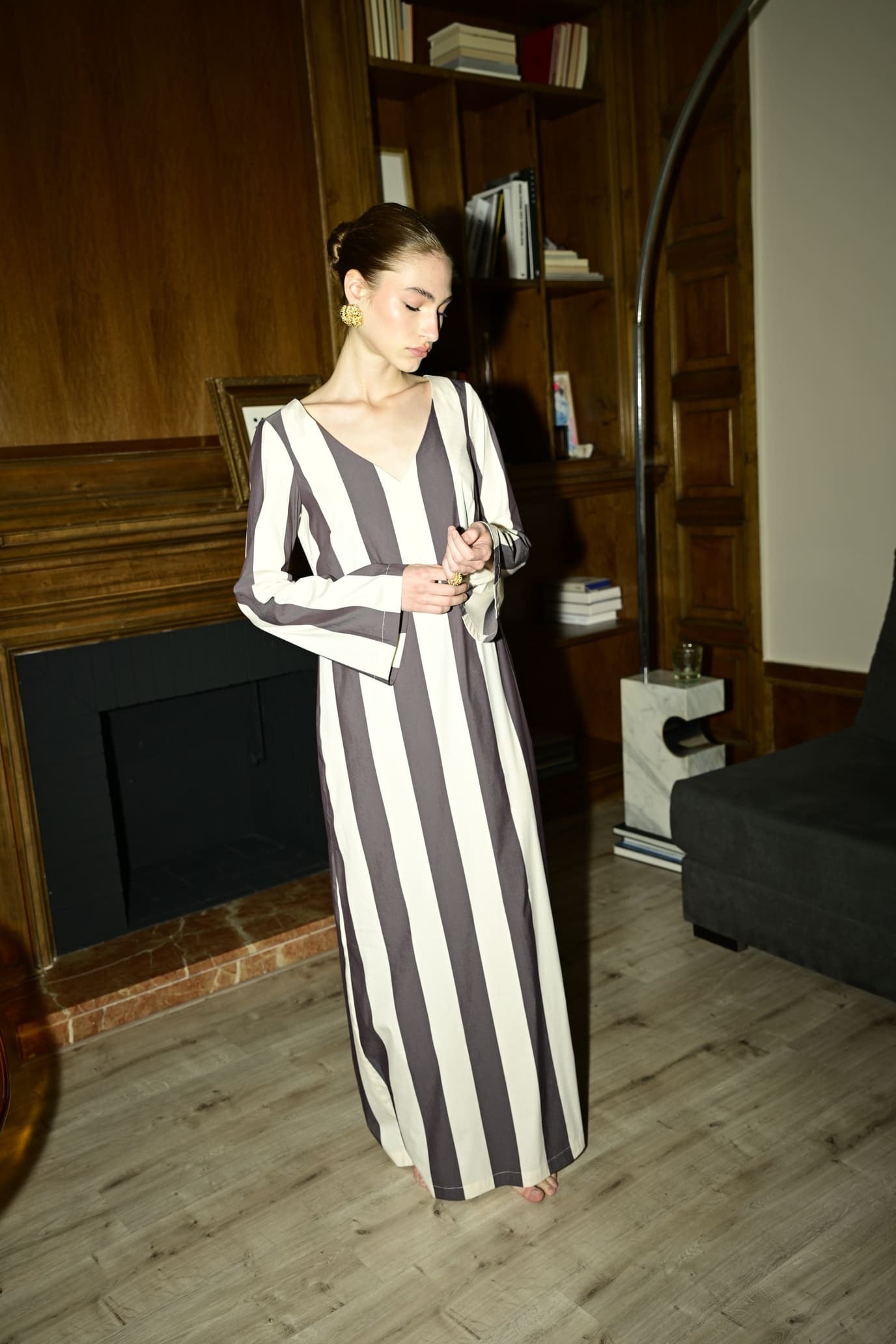 El vestido Marcela es un diseño tipo túnica, con mangas ligeramente acampanadas y escote en V. Un vestido elegante, chic y cómodo, confeccionado a mano en nuestro atelier con esta exclusiva tela en rayas marrón y marfil