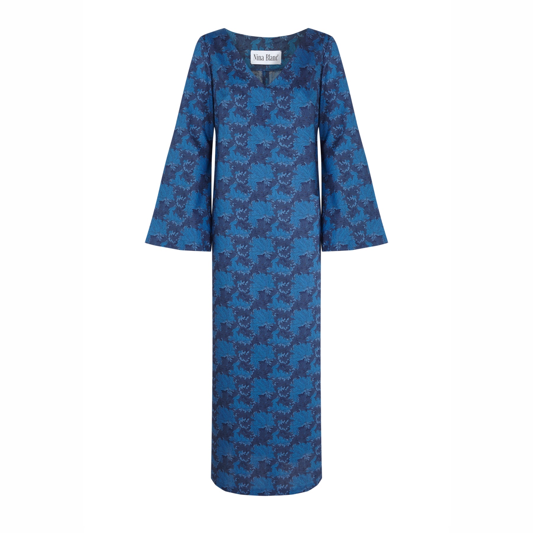 This long dress is crafted in Liberty fabric with an intricate floral print in blue tones. Its straight silhouette and long flared sleeves create an elegant and timeless look. A versatile piece, ideal for special events, weddings, or effortlessly chic outfits that combine sophistication with comfort.