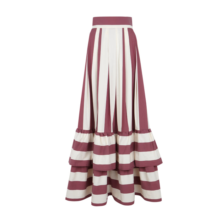 The Maison Lea skirt exudes a charming Mediterranean spirit, where tradition and sophistication meet in a simple yet stylish cut. Handcrafted from a soft fabric with wide vertical stripes in wine and cream tones, it uses over five meters of material to achieve an extraordinary drape and flow.